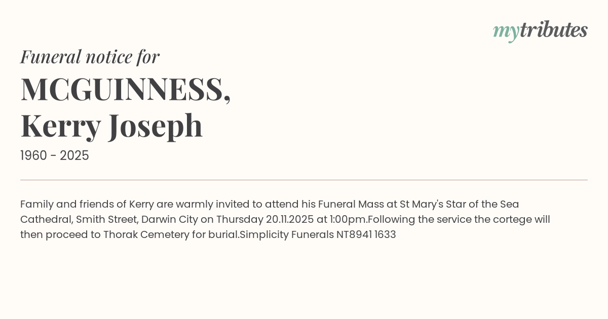 16°CFamily and friends of Kerry are warmly invited to attend his Funeral Mass at St Mary's Star of the Sea Cathedral, Smith Street, Darwin City on Thursday 20.11.2025 at 1:00pm.