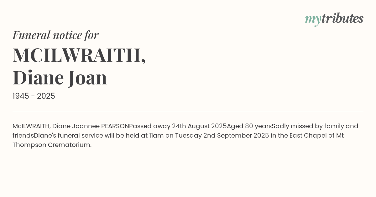 Diane's funeral service will be held at 11am on Tuesday 2nd September 2025 in the East Chapel of Mt Thompson Crematorium.