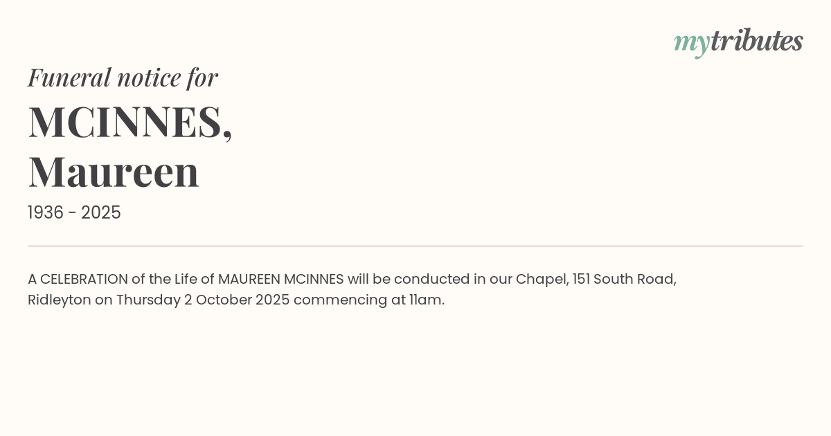 16°CA CELEBRATION of the Life of MAUREEN MCINNES will be conducted in our Chapel, 151 South Road,