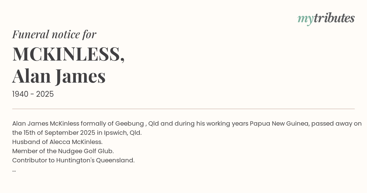 16°CAlan James McKinless formally of Geebung , Qld and during his working years Papua New Guinea, passed away on the 15th of September 2025 in Ipswich, Qld.