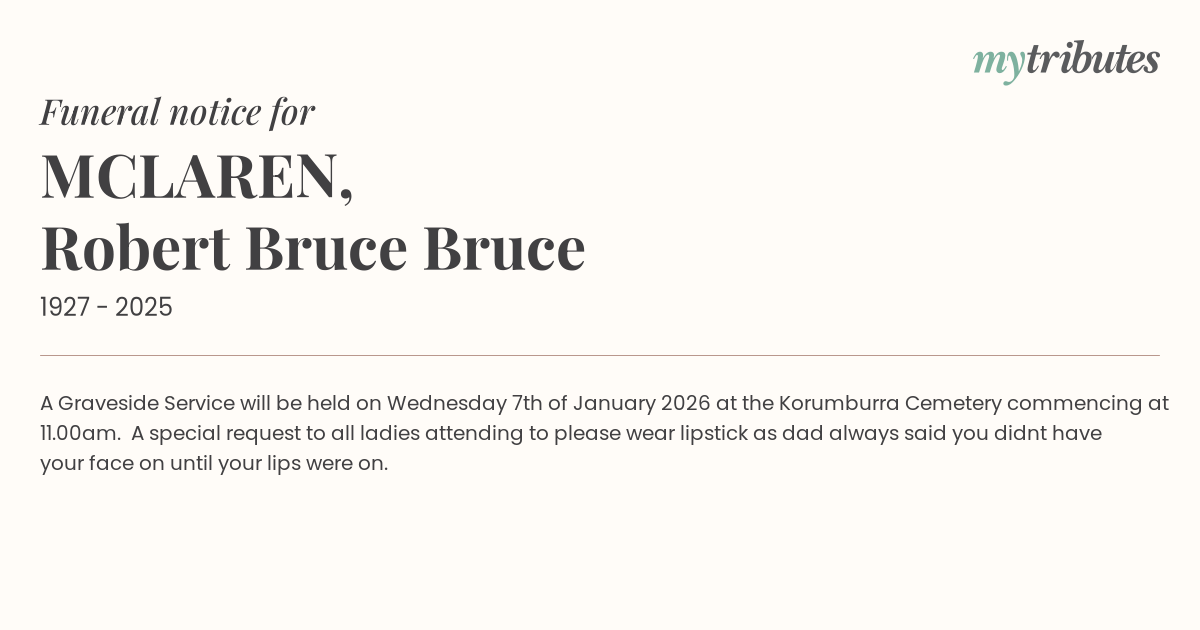 16°CA Graveside Service will be held on Wednesday 7th of January 2026 at the Korumburra Cemetery commencing at 11.00am. A special request to all ladies attending to please wear lipstick as dad always said you didn’t have your face on until your lips were on.
