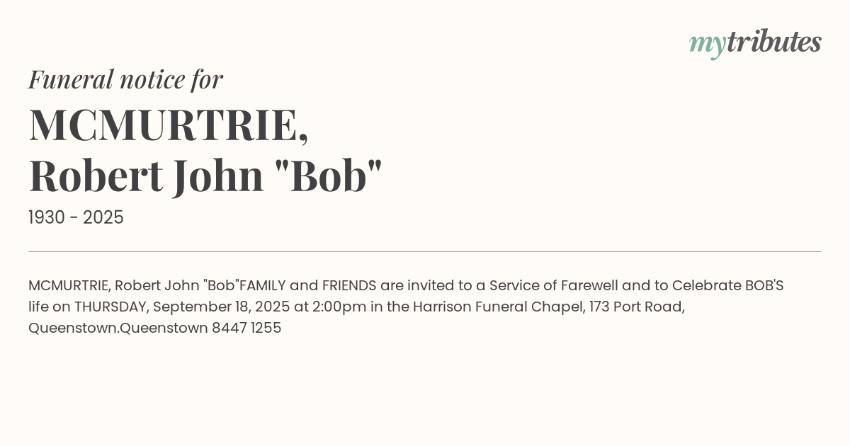 FAMILY and FRIENDS are invited to a Service of Farewell and to Celebrate BOB'S life on THURSDAY, September 18, 2025 at 2:00pm in the Harrison Funeral Chapel, 173 Port Road, Queenstown.