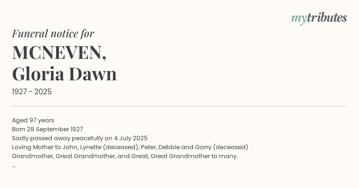 Loving Mother to John, Lynette (deceased), Peter, Debbie and Garry (deceased)