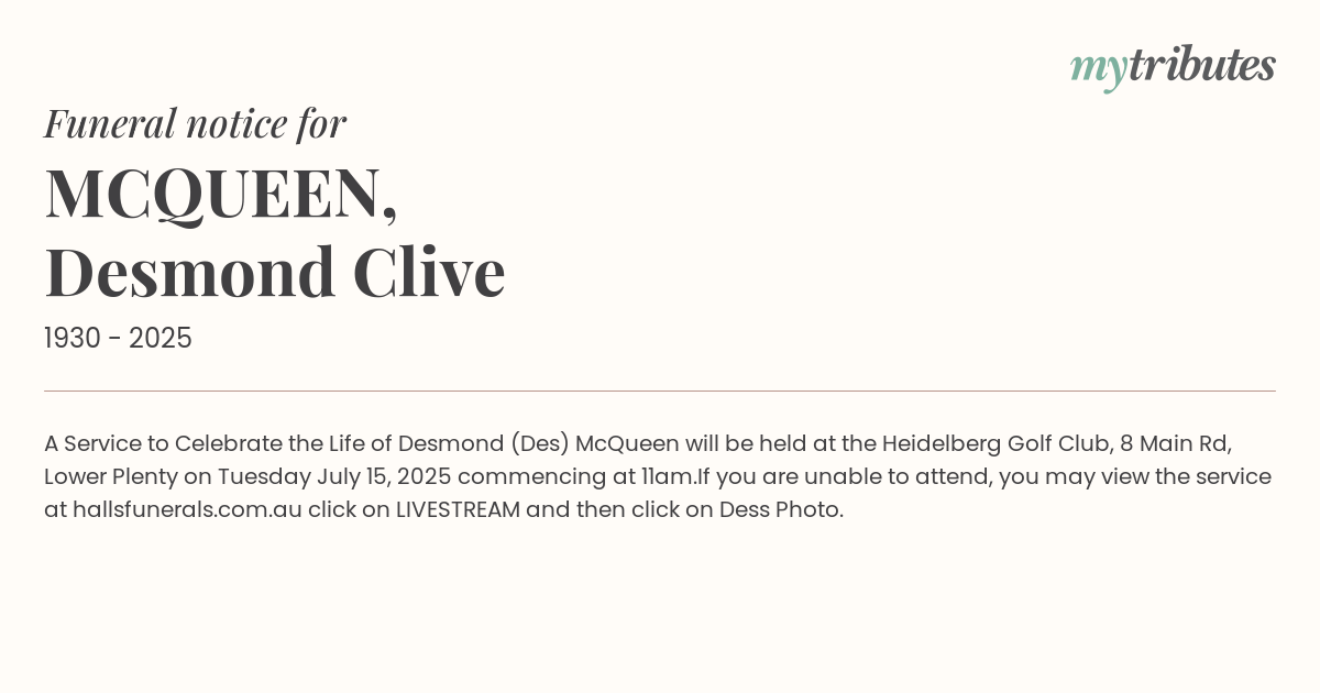 16°CA Service to Celebrate the Life of Desmond (Des) McQueen will be held at the Heidelberg Golf Club, 8 Main Rd, Lower Plenty on Tuesday July 15, 2025 commencing at 11am.