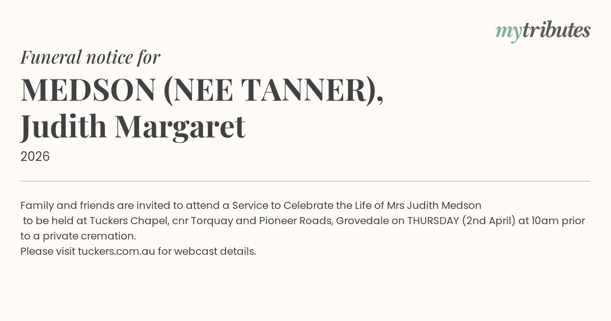16°CFamily and friends are invited to attend a Service to Celebrate the Life of Mrs Judith Medson