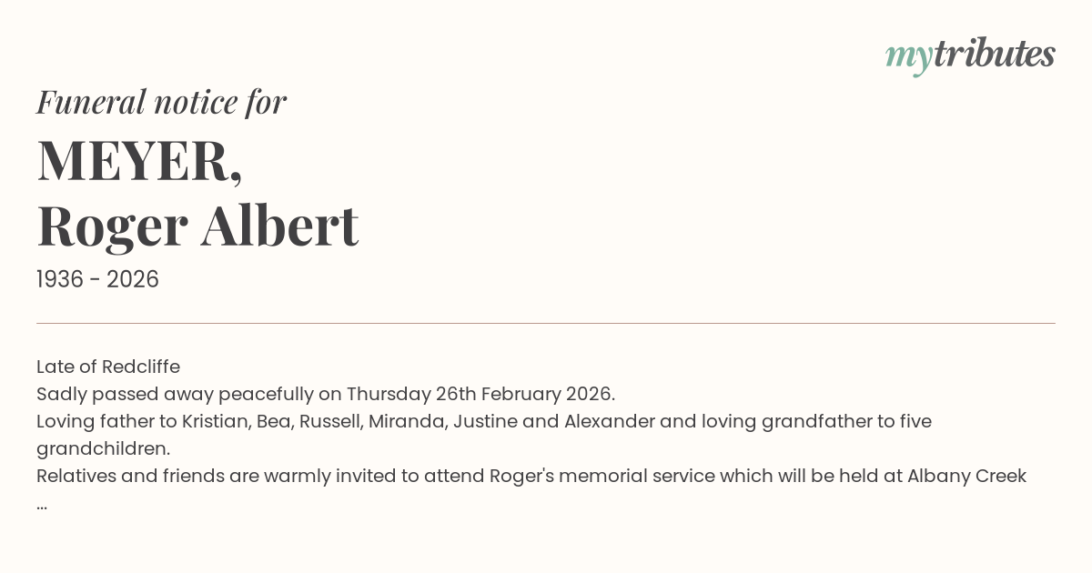 Relatives and friends are warmly invited to attend Roger's memorial service which will be held at Albany Creek Memorial Park - Garden Chapel on Thursday 12th March 2026 at 10:30AM.