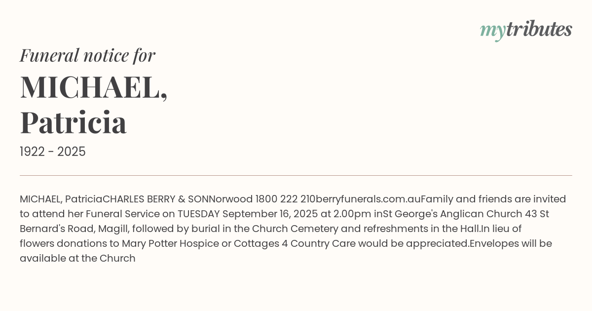 St George's Anglican Church 43 St Bernard's Road, Magill, followed by burial in the Church Cemetery and refreshments in the Hall.
