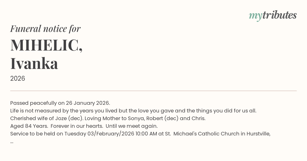 Service to be held on Tuesday 03/February/2026 10:00 AM at St. Michael's Catholic Church in Hurstville, followed by burial at Rookwood Catholic at 11.30am on the same day.