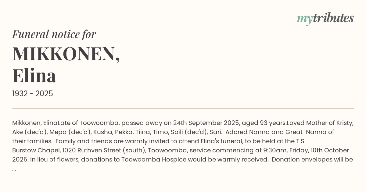 Family and friends are warmly invited to attend Elina's funeral, to be held at the T.S Burstow Chapel, 1020 Ruthven Street (south), Toowoomba, service commencing at 9:30am, Friday, 10th October 2025.