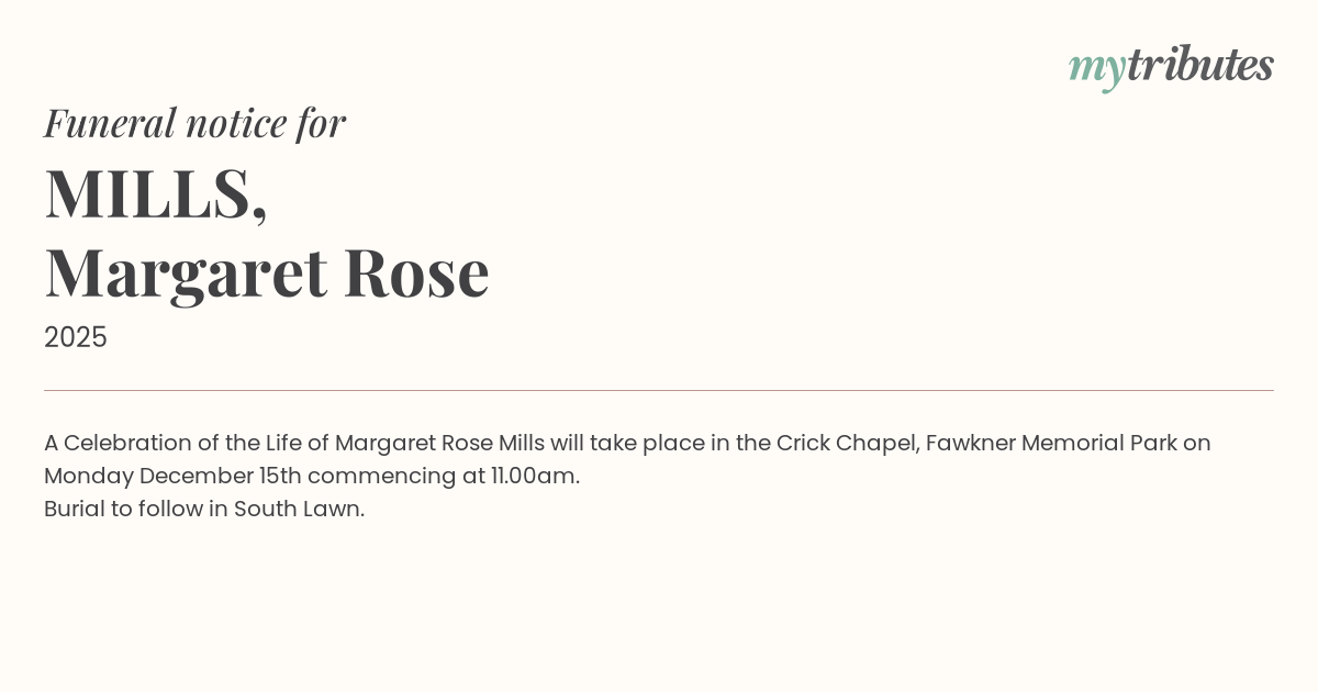 16°CA Celebration of the Life of Margaret Rose Mills will take place in the Crick Chapel, Fawkner Memorial Park on Monday December 15th commencing at 11.00am.