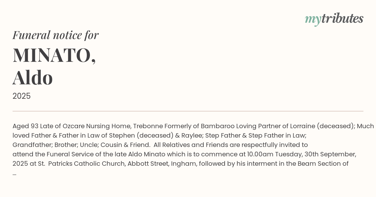 All Relatives and Friends are respectfully invited to attend the Funeral Service of the late Aldo Minato which is to commence at 10.00am Tuesday, 30th September, 2025 at St. Patrick’s Catholic Church, Abbott Street, Ingham, followed by his interment in the Beam Section of the New Ingham Cemetery.