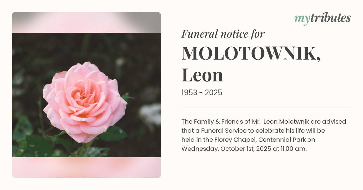 16°CThe Family & Friends of Mr. Leon Molotwnik are advised that a Funeral Service to celebrate his life will be held in the Florey Chapel, Centennial Park on Wednesday, October 1st, 2025 at 11.00 am.