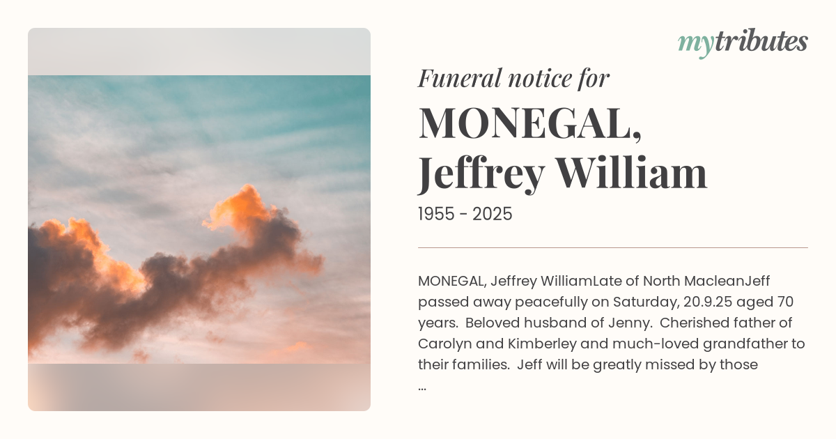 Jeff passed away peacefully on Saturday, 20.9.25 aged 70 years. Beloved husband of Jenny. Cherished father of Carolyn and Kimberley and much-loved grandfather to their families. Jeff will be greatly missed by those who knew and loved him. Relatives and friends are respectfully invited to attend a funeral service for Jeff to be held on Tuesday, 30 September 2025 at Mt Gravatt crematorium chapel, at 12:30pm. In lieu of sending flowers Jeff's family encourage donations to the PA hospital research foundation. The family asks for friends and family to dress in bright colours.