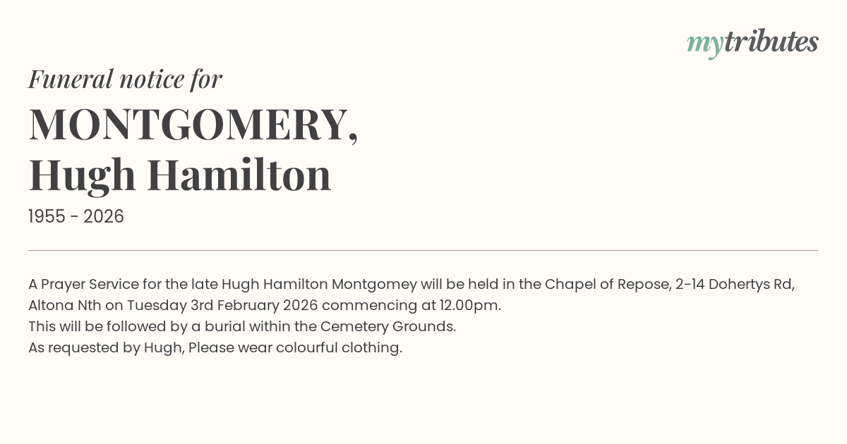 16°CA Prayer Service for the late Hugh Hamilton Montgomey will be held in the Chapel of Repose, 2-14 Doherty’s Rd, Altona Nth on Tuesday 3rd February 2026 commencing at 12.00pm.