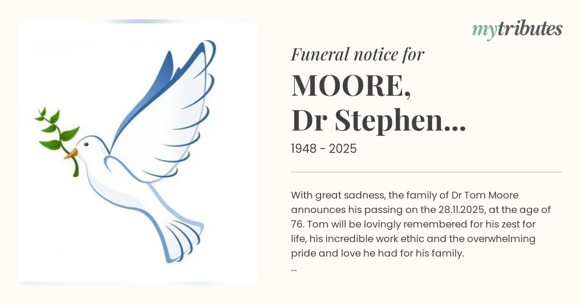 16°CWith great sadness, the family of Dr Tom Moore announces his passing on the 28.11.2025, at the age of 76. Tom will be lovingly remembered for his zest for life, his incredible work ethic and the overwhelming pride and love he had for his family.