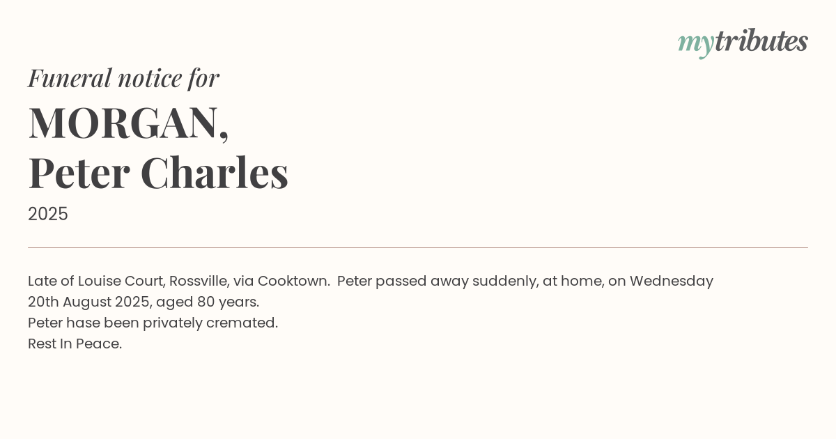 16°CLate of Louise Court, Rossville, via Cooktown. Peter passed away suddenly, at home, on Wednesday