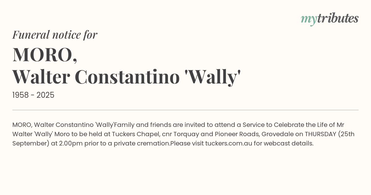Family and friends are invited to attend a Service to Celebrate the Life of Mr Walter 'Wally' Moro to be held at Tuckers Chapel, cnr Torquay and Pioneer Roads, Grovedale on THURSDAY (25th September) at 2.00pm prior to a private cremation.