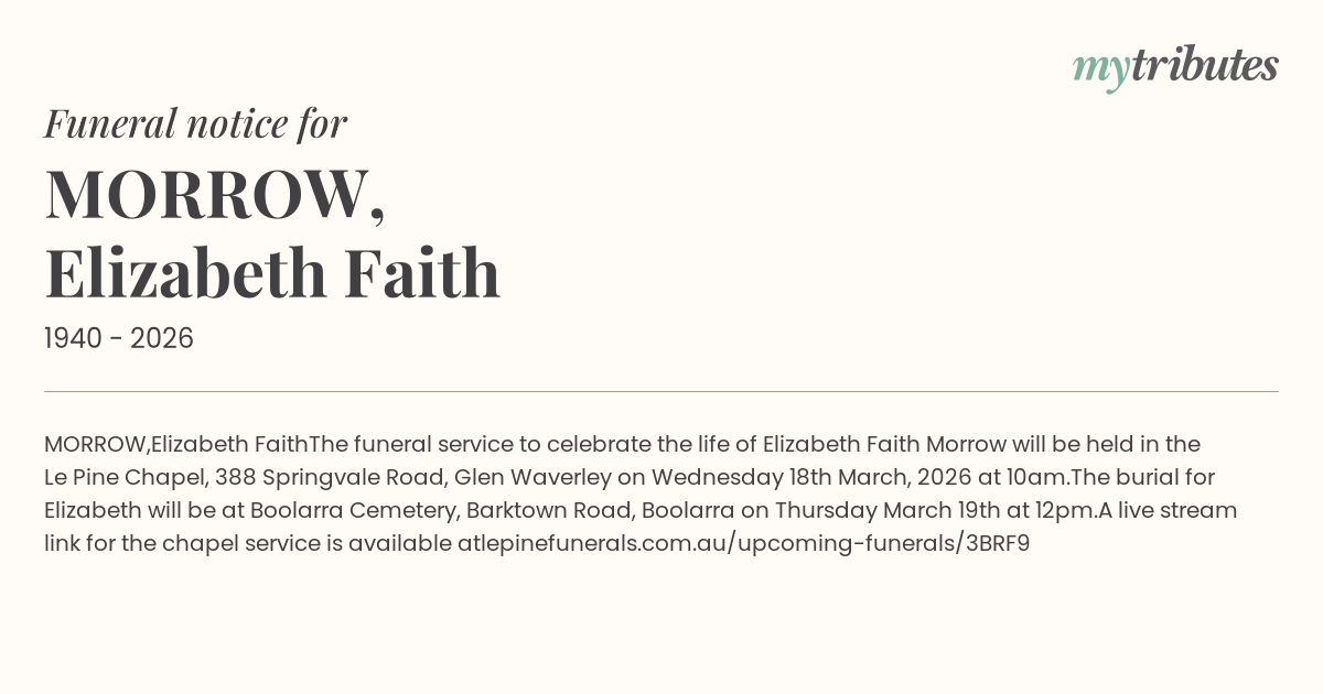 The funeral service to celebrate the life of Elizabeth Faith Morrow will be held in the Le Pine Chapel, 388 Springvale Road, Glen Waverley on Wednesday 18th March, 2026 at 10am.