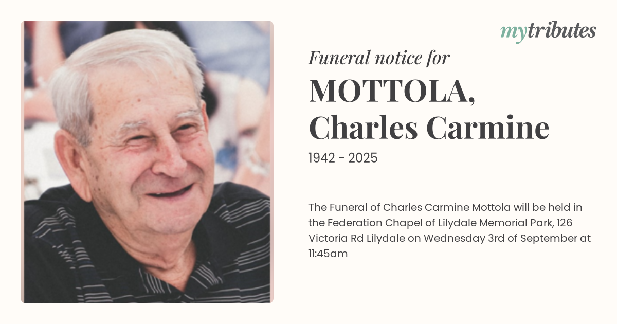 16°CThe Funeral of Charles Carmine Mottola will be held in the Federation Chapel of Lilydale Memorial Park, 126 Victoria Rd Lilydale on Wednesday 3rd of September at 11:45am