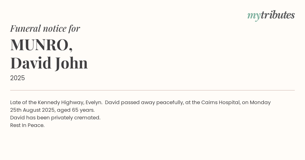 16°CLate of the Kennedy Highway, Evelyn. David passed away peacefully, at the Cairns Hospital, on Monday