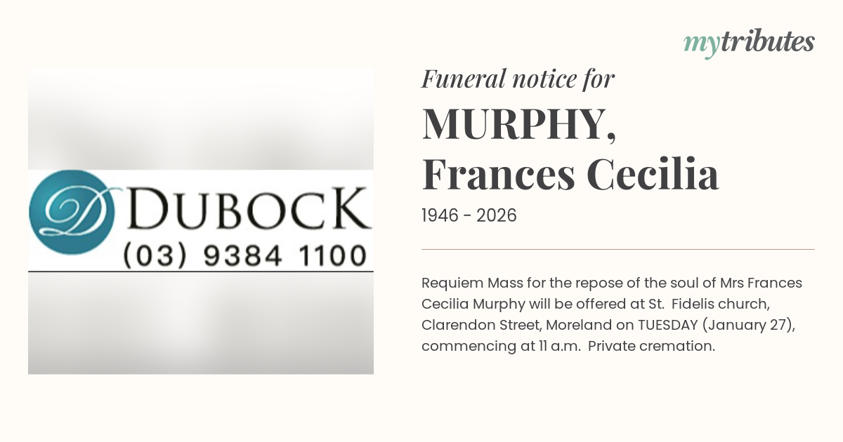 16°CRequiem Mass for the repose of the soul of Mrs Frances Cecilia Murphy will be offered at St. Fidelis’ church, Clarendon Street, Moreland on TUESDAY (January 27), commencing at 11 a.m. Private cremation.
