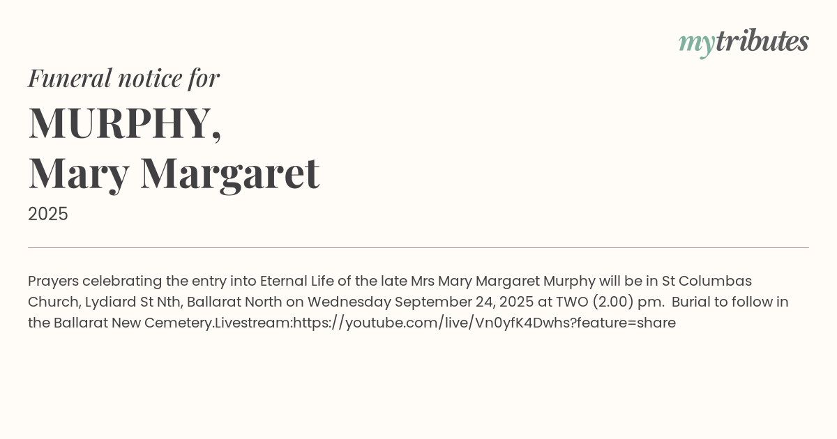 Prayers celebrating the entry into Eternal Life of the late Mrs Mary Margaret Murphy will be in St Columbas Church, Lydiard St Nth, Ballarat North on Wednesday September 24, 2025 at TWO (2.00) pm. Burial to follow in the Ballarat New Cemetery.