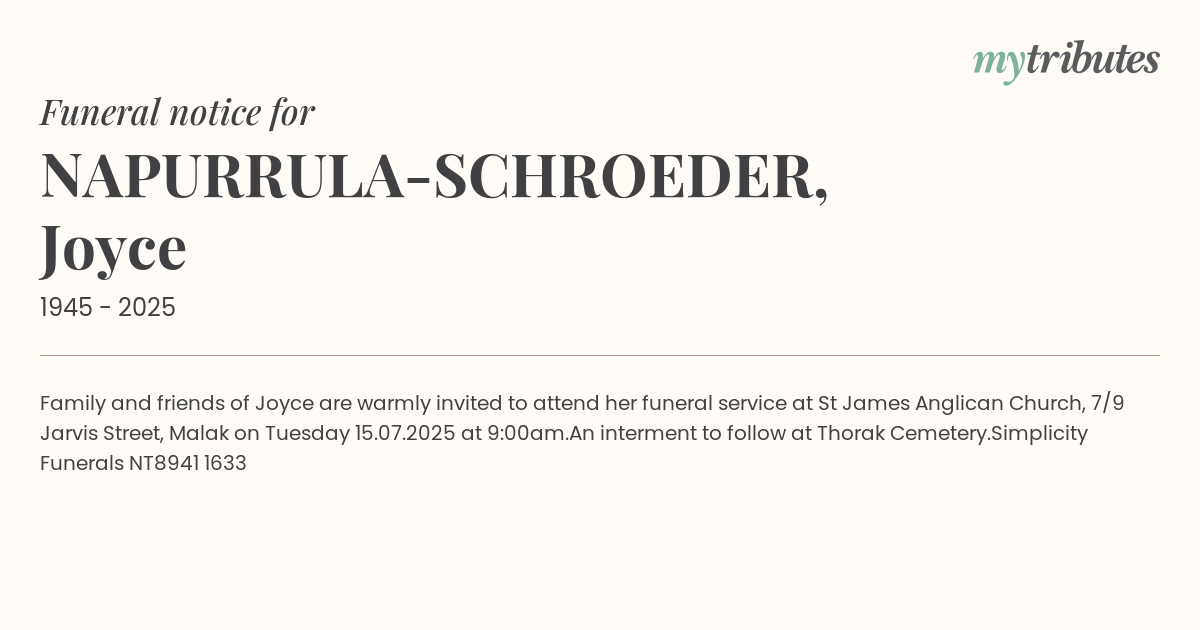16°CFamily and friends of Joyce are warmly invited to attend her funeral service at St James Anglican Church, 7/9 Jarvis Street, Malak on Tuesday 15.07.2025 at 9:00am.