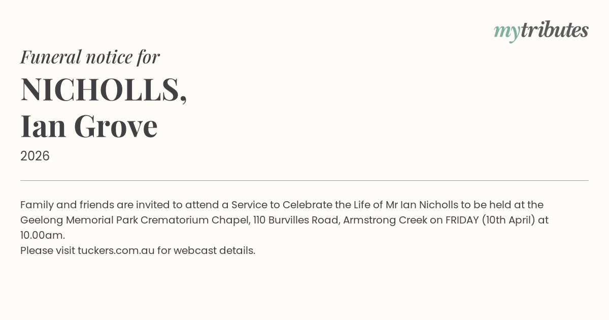 16°CFamily and friends are invited to attend a Service to Celebrate the Life of Mr Ian Nicholls to be held at the Geelong Memorial Park Crematorium Chapel, 110 Burvilles Road, Armstrong Creek on FRIDAY (10th April) at 10.00am.