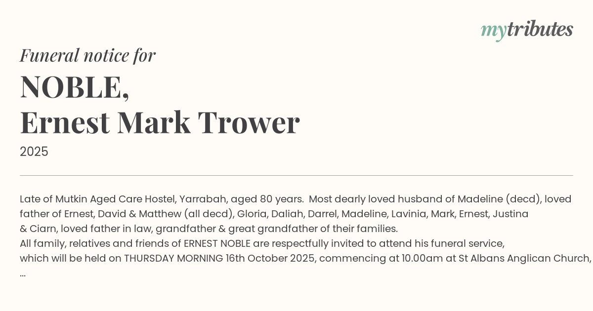 All family, relatives and friends of ERNEST NOBLE are respectfully invited to attend his funeral service, which will be held on THURSDAY MORNING 16th October 2025, commencing at 10.00am at St Alban’s Anglican Church, Yarrabah, followed by interment