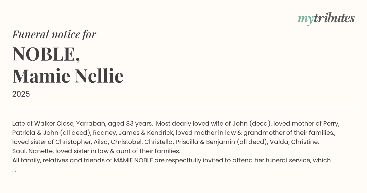 All family, relatives and friends of MAMIE NOBLE are respectfully invited to attend her funeral service, which will be held on FRIDAY MORNING 10th October 2025, commencing at 10.00am at St Alban’s Anglican Church, Yarrabah, followed by interment at the Yarrabah Monumental Cemetery.