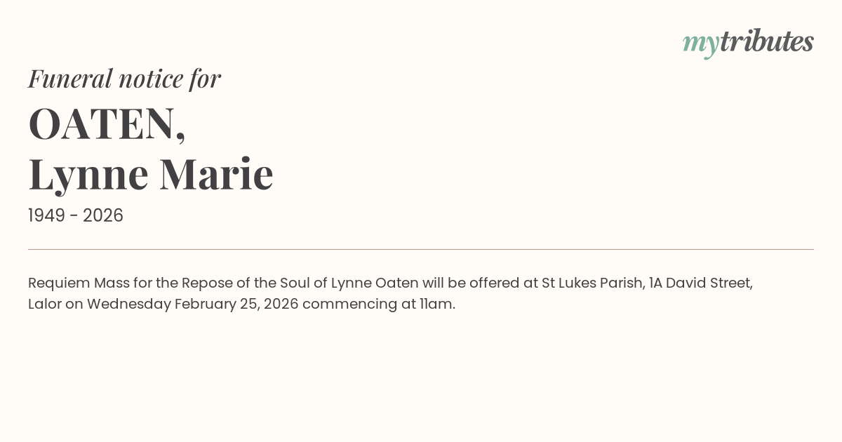 16°CRequiem Mass for the Repose of the Soul of Lynne Oaten will be offered at St Luke’s Parish, 1A David Street, Lalor on Wednesday February 25, 2026 commencing at 11am.