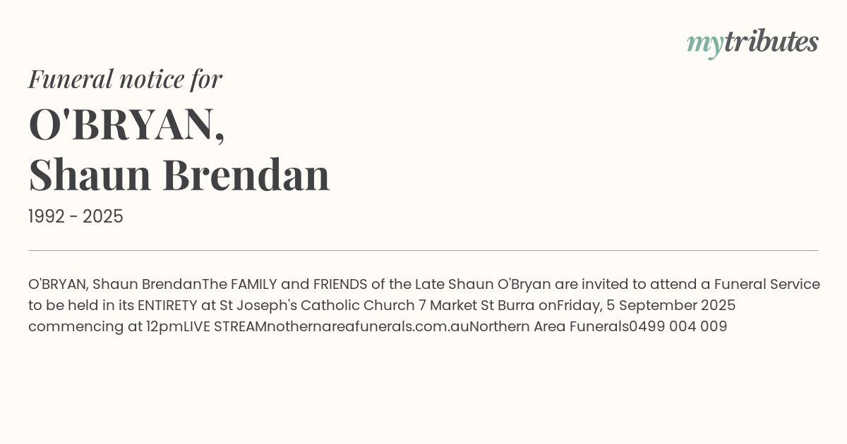 The FAMILY and FRIENDS of the Late Shaun O'Bryan are invited to attend a