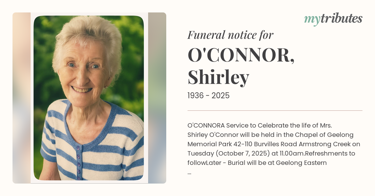 A Service to Celebrate the life of Mrs. Shirley O'Connor will be held in the Chapel of Geelong Memorial Park 42-110 Burvilles Road Armstrong Creek on Tuesday (October 7, 2025) at 11.00am.
