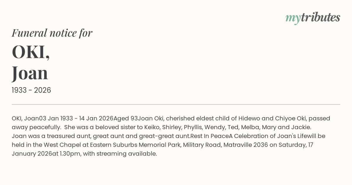 cherished eldest child of Hidewo and Chiyoe Oki, passed away peacefully.