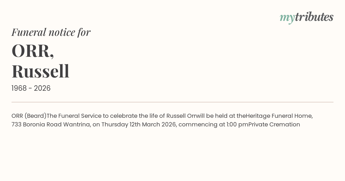 Heritage Funeral Home, 733 Boronia Road Wantrina, on Thursday 12th March 2026, commencing at 1:00 pm