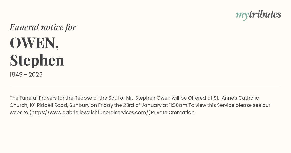 16°CThe Funeral Prayers for the Repose of the Soul of Mr. Stephen Owen will be Offered at St. Anne's Catholic Church, 101 Riddell Road, Sunbury on Friday the 23rd of January at 11:30am.