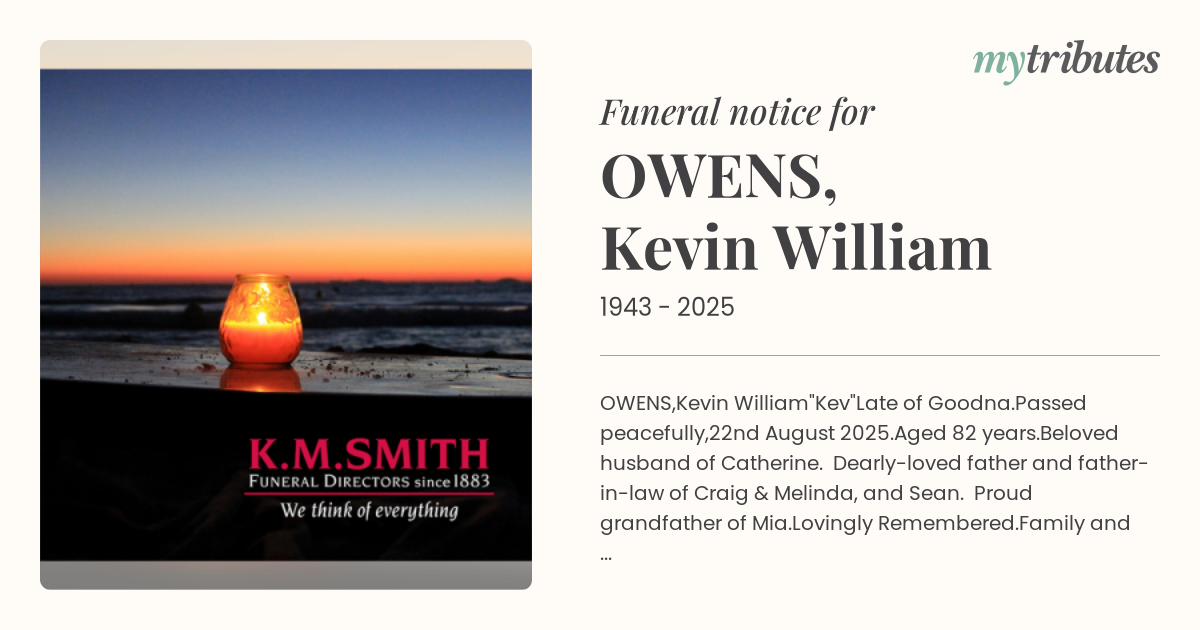 Family and friends are invited to celebrate Kev's life in Heritage Park Crematorium Chapel, 113 Stuart Street, Goodna, on Thursday, 4th September 2025 at 10.30 a.m.