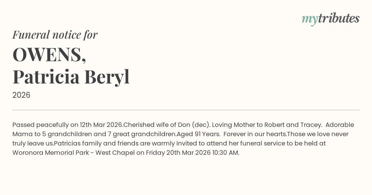 Patricia’s family and friends are warmly invited to attend her funeral service to be held at Woronora Memorial Park - West Chapel on Friday 20th Mar 2026 10:30 AM.