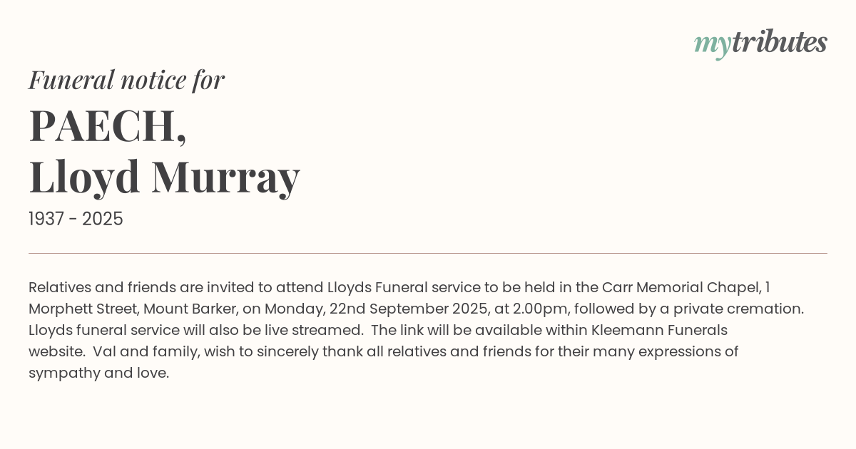 16°CRelatives and friends are invited to attend Lloyd’s Funeral service to be held in the Carr Memorial Chapel, 1 Morphett Street, Mount Barker, on Monday, 22nd September 2025, at 2.00pm, followed by a private cremation. Lloyd’s funeral service will also be live streamed. The link will be available within Kleemann Funerals website. Val and family, wish to sincerely thank all relatives and friends for their many expressions of sympathy and love.