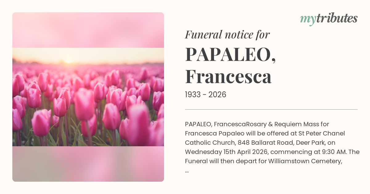 Rosary & Requiem Mass for Francesca Papaleo will be offered at St Peter Chanel Catholic Church, 848 Ballarat Road, Deer Park, on Wednesday 15th April 2026, commencing at 9:30 AM. The Funeral will then depart for Williamstown Cemetery, Champion Road Williamstown where Francesca will be laid to rest.