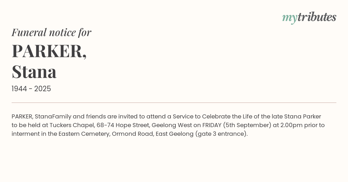 Family and friends are invited to attend a Service to Celebrate the Life of the late Stana Parker to be held at Tuckers Chapel, 68-74 Hope Street, Geelong West on FRIDAY (5th September) at 2.00pm prior to interment in the Eastern Cemetery, Ormond Road, East Geelong (gate 3 entrance).
