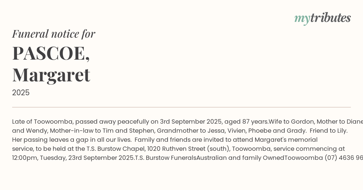 Family and friends are invited to attend Margaret's memorial service, to be held at the T.S. Burstow Chapel, 1020 Ruthven Street (south), Toowoomba, service commencing at 12:00pm, Tuesday, 23rd September 2025.