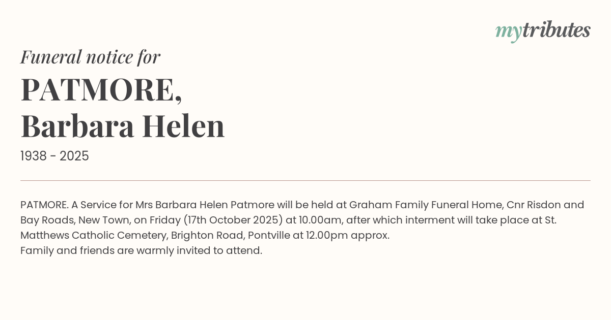16°CPATMORE. A Service for Mrs Barbara Helen Patmore will be held at Graham Family Funeral Home, Cnr Risdon and Bay Roads, New Town, on Friday (17th October 2025) at 10.00am, after which interment will take place at St. Matthew’s Catholic Cemetery, Brighton Road, Pontville at 12.00pm approx.