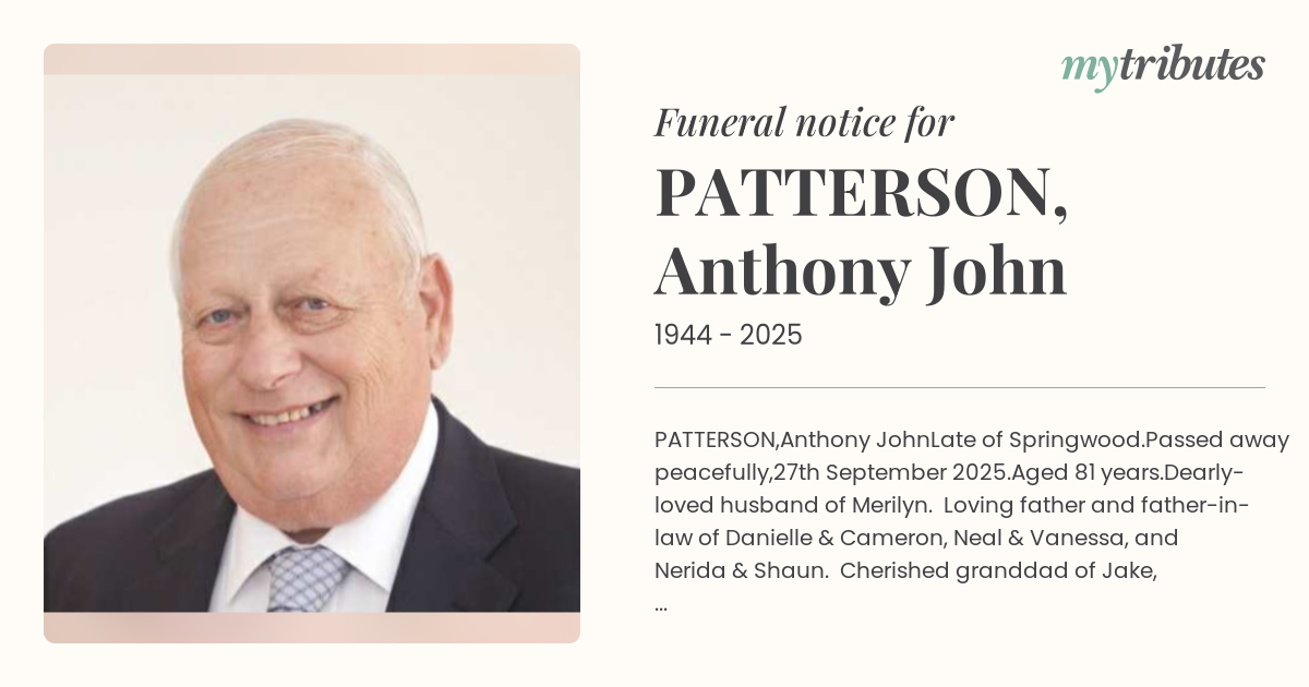 Family and friends of Tony are invited to attend a funeral service in St Edward's the Confessor Catholic Church, 104 Chatswood Road, Daisy Hill, on Thursday, 9th October, commencing at 11.00 a.m.