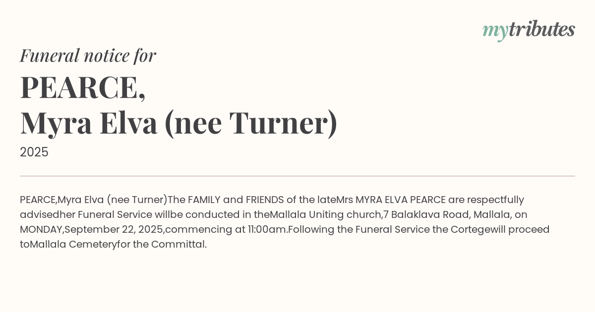 Mrs MYRA ELVA PEARCE are respectfully advised
