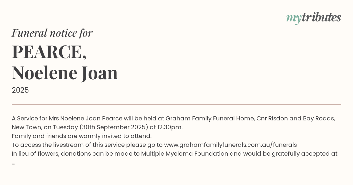 16°CA Service for Mrs Noelene Joan Pearce will be held at Graham Family Funeral Home, Cnr Risdon and Bay Roads, New Town, on Tuesday (30th September 2025) at 12.30pm.