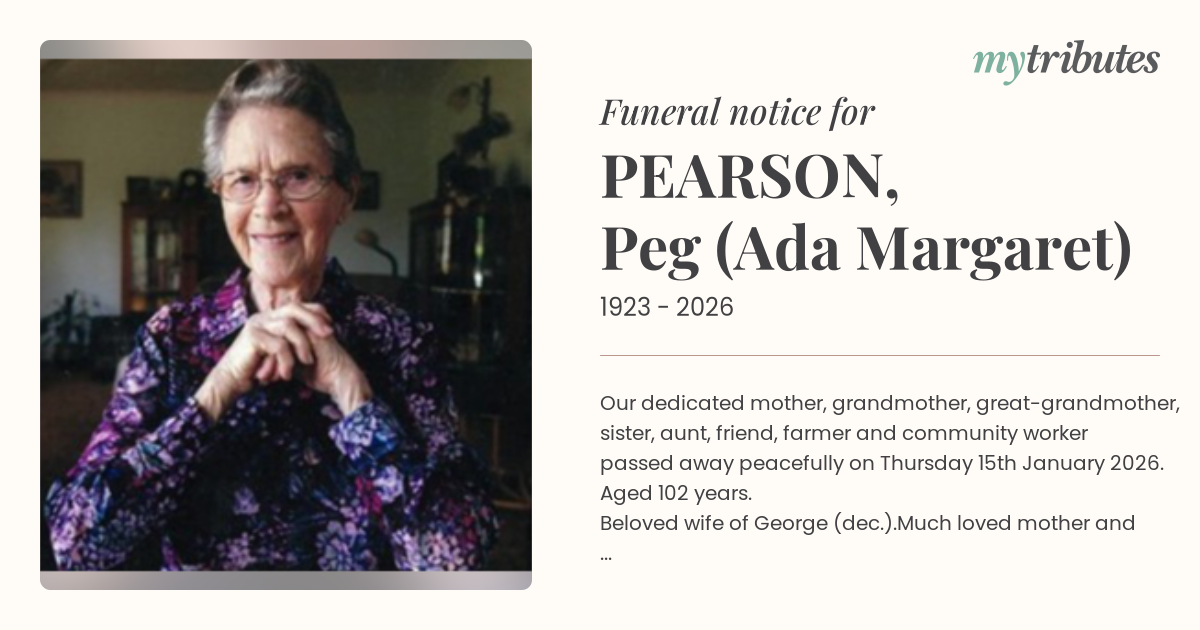 16°COur dedicated mother, grandmother, great-grandmother, sister, aunt, friend, farmer and community worker passed away peacefully on Thursday 15th January 2026. Aged 102 years. Beloved wife of George (dec.).Much loved mother and mother-in-law of Ross and Ann, Alison and Paul, and Janice. Very special grandma of Carl, Rodney, Gail, David, Graham, Barbara, Alice and Shaun. Sister of Walter.
