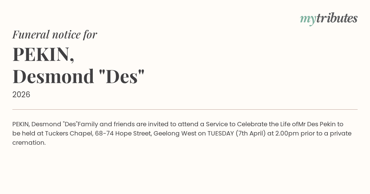 Mr Des Pekin to be held at Tuckers Chapel, 68-74 Hope Street, Geelong West on TUESDAY (7th April) at 2.00pm prior to a private cremation.