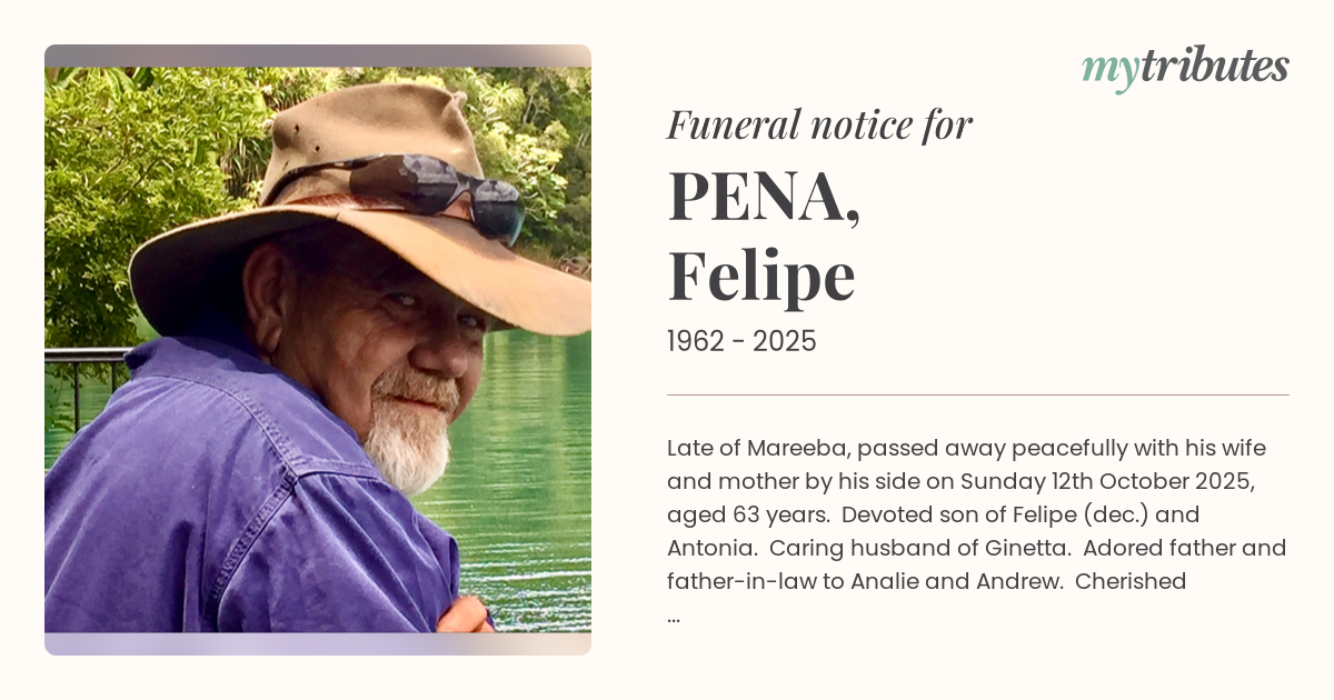 16°CLate of Mareeba, passed away peacefully with his wife and mother by his side on Sunday 12th October 2025, aged 63 years. Devoted son of Felipe (dec.) and Antonia. Caring husband of Ginetta. Adored father and father-in-law to Analie and Andrew. Cherished grandfather to Ajay. Phil was loved by many and will be missed by all. ~ He nurtured his vegetables from his fields to Rusty’s Market, with care and love in every step ~ Relatives and friends of Phil are respectfully invited to attend his funeral which is appointed to move from St Thomas Catholic Church, Constance Street, Mareeba on Thursday 23rd October 2025 after a service commencing at 10.30am for interment at Mareeba Cemetery.