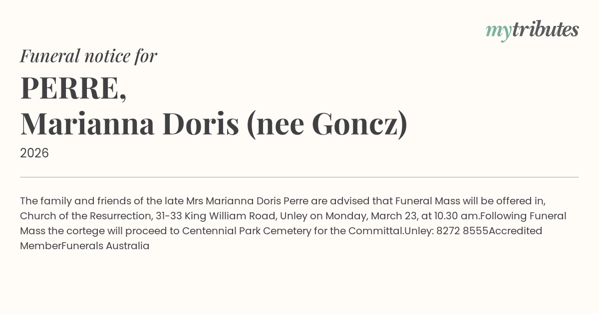 16°CThe family and friends of the late Mrs Marianna Doris Perre are advised that Funeral Mass will be offered in, Church of the Resurrection, 31-33 King William Road, Unley on Monday, March 23, at 10.30 am.